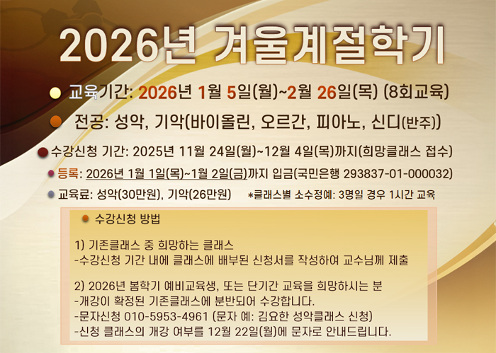 내 용 : 희망 클래스 별 소수정예 레슨 대 상 : 현 교회음악과정 교육생 및 예비교육생 기 간 : 매년 여름방학(7~8월)과 겨울방학(1~2월) 중 실시 (주1회 클래스별 강의시간 상이함)